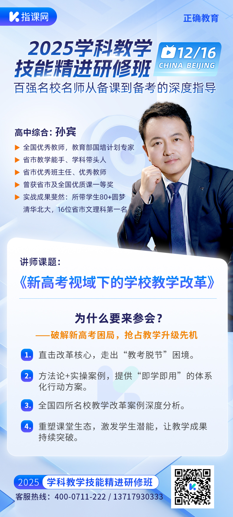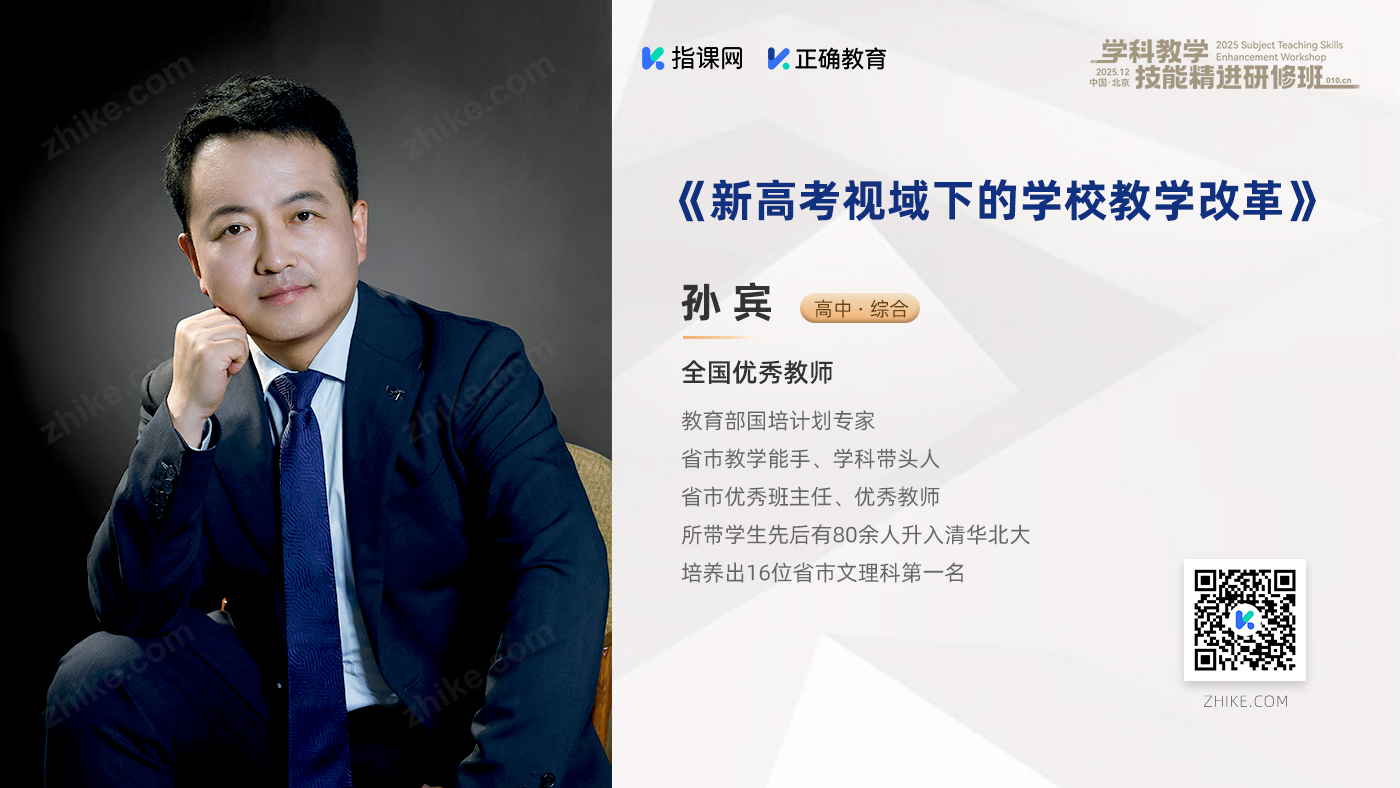 孙宾,全国优秀教师,教育部国培计划专家。先后获得省市教学能手、学科带头人、优秀班主任、优秀教师等称号,省市及全国优质课一等奖等荣誉。所带学生先后有80余人升入清华北大,培养出16个省市文理科第一名。参与编写出版了《中学学科核心素养通典》《大学专业全景》等5部专著,撰写了30余篇学术论文发表于省级国家级核心期刊。近年来,受邀在湖南师范大学、北京市人大附中、河北省衡水中学、河南省实验中学、广东省珠海二中、新疆石河子市一中等学校作学术报告达500余场。