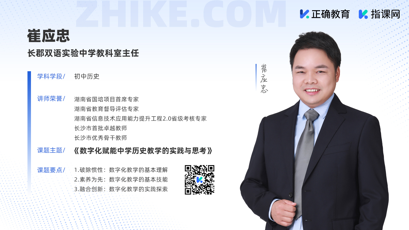 崔应忠,中学历史高级教师,长郡双语实验中学教科室主任,湖南省教师培训师,湖南师范大学校外导师,湖南省教育督导评估专家,湖南省基础教育省级兼职教研员,湖南省信息技术应用能力提升工程2.0省级考核专家,湖南省电化教育馆评审专家,长沙市首批卓越教师,长沙市优秀骨干教师,长沙市名师农村工作站站长,长沙市初中历史学科教研基地主持人,长沙市龚宇中学历史名师工作室名师,长沙市教育科学研究院课程建设专家库成员,长沙市中小学教师信息技术与教育教学融合研究团队历史学科专家,长沙市智慧教育讲师团首批成员,湖南省国培项目优秀培训者,湖南省国培项目首席专家,湖南省省级骨干教师工作坊坊主持人,中学历史省级卓越教师领航工作坊坊主,希沃杏坛四星导师。多次荣获国家、省级赛课一等奖,主持和参与省级课题研究十五项,有四十多篇论文发表与获奖,独著和参编著作十部,主编十多种教辅资料,受邀在省内外国培计划、教师培训上讲座分享六百多次。