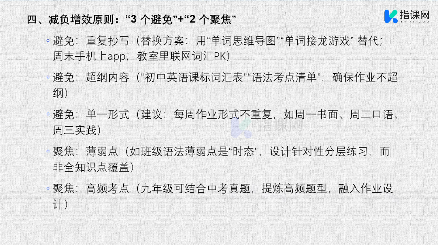 本次课题聚焦当前作业“一刀切、负担重、效度低”之弊,提出“分层、情境、进阶、减负”四原则:依据诊断数据把学生分A/B/C层,匹配难度与数量;任务嵌入校园、跨文化等真实情境,激活语用;听说读写看五技纵向进阶,兼顾中考与核心素养;避免机械重复、惩罚性、无效刷题,聚焦易错点与语用能力。实操采用“课前微诊断→三层目标→套餐式任务→线上微课+线下探究”模式,配套可视化量规,学生自评、同伴互评、教师增值评价三线并进,实现精准反馈、错题再生、个性推送。实践表明,作业时长减30%,优生挑战度提20%,学困生合格率升25%,形成“高效-轻负-乐学”的良性循环。