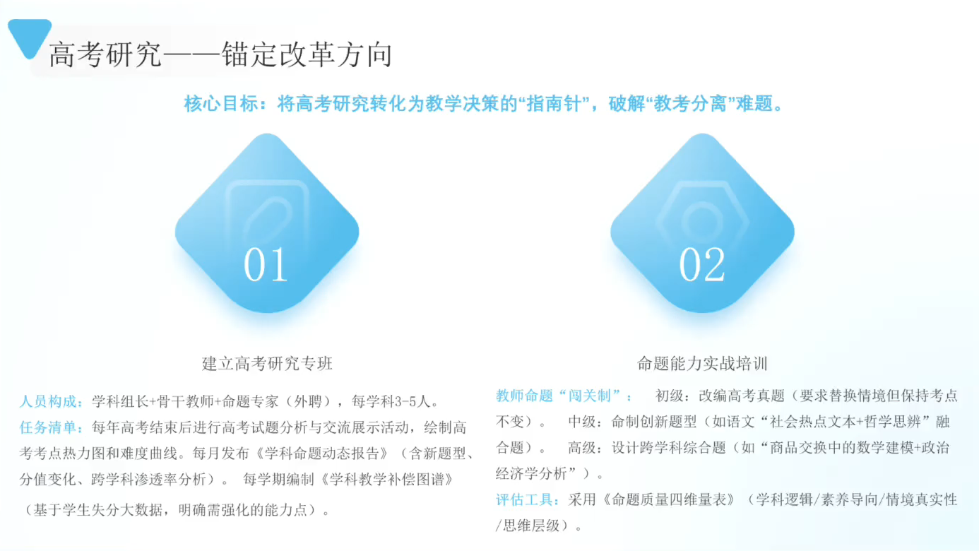 新高考驱动学校系统性变革。研究以“六位一体”框架重构教学:先以大数据高考研究锚定方向,推动教研从经验走向实证;继而实施课程供给端改革,打造分层、综合、实践导向的新课表;同步开展“课堂革命”,推广项目化、混合式学习,实现深度学习转型;配套构建德育融入、教师发展、校长行动清单的保障体系。课题深度剖析镇海中学“选课走班+导师制”、忻州一中“精准教学+生涯规划”、精英中学“激情德育+高效课堂”、东辰学校“学本课堂+技术赋能”等名校案例,提炼可复制的改革路径与关键指标,为区域和学校提供可操作的改革范式,助推育人方式从“分数导向”走向“素养导向”。