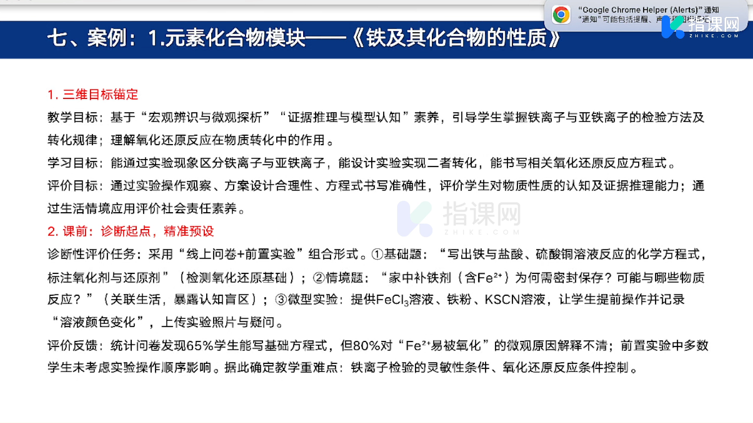 本课题提出高中化学“教学评一体化”:以核心素养为锚,将目标、活动、评价熔为“三位一体”,遵循目标精准、活动嵌入、评价即时、反馈闭环四大原则,贯通课前诊断—课中嵌入式—课后拓展性评价全流程。课堂用追问、实验观察、情感温度计等多元工具采集证据,作业配套量表,试题基于真实情境四层命题,实现知识、思维、价值同评。案例显示:铁化合物、合成氨、二氧化硫三模块通过“问题链—实验证—评价单”同步推进,学生错误率降18%,探究指数升32%,验证该模式是素养落地、课堂提质、教师专业发展的核心抓手与长效体系。