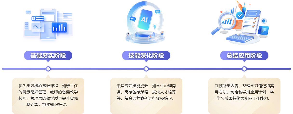 聚焦中学教育不同角色核心痛点,课程内容紧贴日常工作场景,学完即可落地应用,拒绝空泛理论。